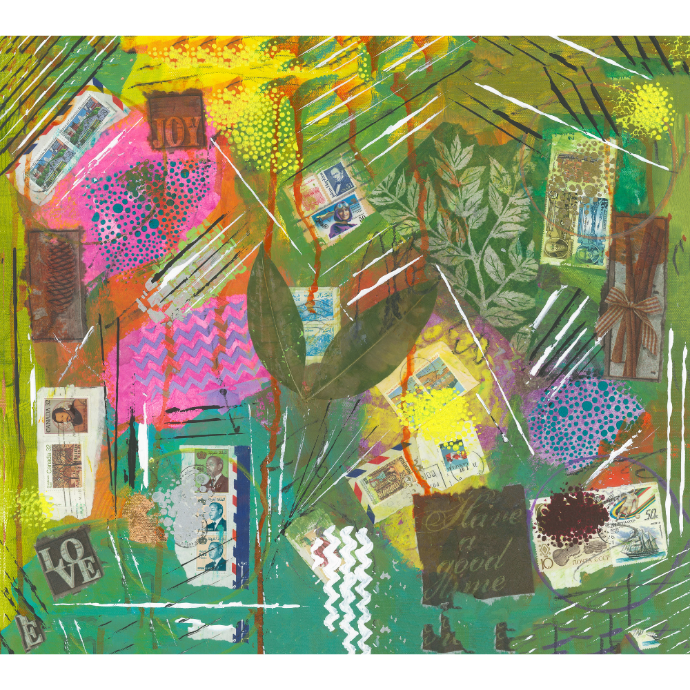 Title: A Simple and Fun Collage Abstract Acrylic Painting 16″ X 20″ X 1.5” / 40.6 cm X 58.8 cm X 3.81 cm Canvas Painted: 2021 Catalog # ADA0120